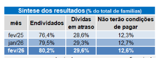 Um fator preocupante deste ano é que, após três meses de redução, houve aumento em fevereiro do percentual de inadimplência que atingiu 29,6%, a maior taxa desde novembro do ano passado (30,0%). Em relação ao percentual de famílias que não terão condições de pagar as dívidas em atraso, houve ligeira redução de 0,1 p.p., alcançando 12,6%, acima do nível do resultado de 2025.