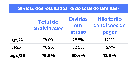 Já a parcela de famílias que declararam não ter condições de pagar suas dívidas ficou em 2,3%, bem abaixo dos 4,7% registrados no mesmo período de 2024.