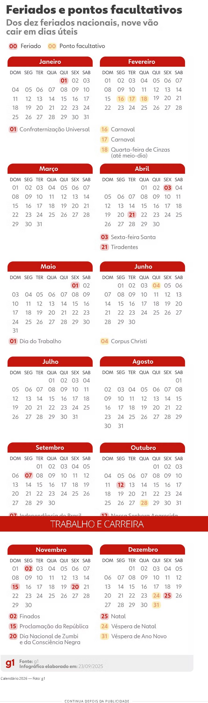 Confira a seguir os feriados e pontos facultativos de 2026: