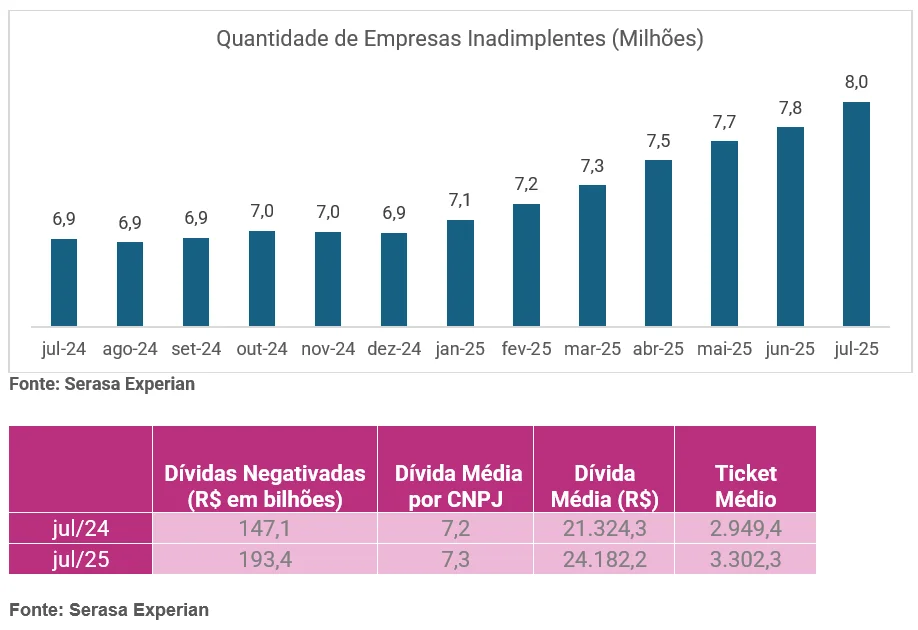 No comparativo com exatamente um ano antes, em julho de 2024, foi registrado um crescimento de 1,1 milhão de pessoas jurídicas inadimplentes, segundo dados do Indicador de Inadimplência das Empresas, elaborado pela Serasa Experian.