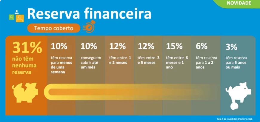 Entre as pessoas que investem, a situação é um pouco mais favorável: 47% possuem reservas por até seis meses e 42% teriam fôlego financeiro para um período superior, enquanto 11% não possuem qualquer recurso para emergências.