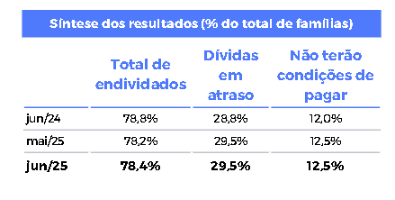 A proporção de famílias que declararam não ter condições de pagar suas dívidas também baixou. Em junho, o índice foi de 2,1%, abaixo dos 2,4% registrados em maio e dos 3,8% no mesmo período de 2024.