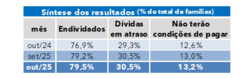 O percentual de famílias que relataram ter dívidas a vencer (cartão de crédito, cheque especial, carnê de loja, crédito consignado, empréstimo pessoal, cheque pré-datado e prestações de carro e casa) continua avançando desde fevereiro, alcançando 79,5% em outubro de 2025, o maior percentual da série histórica.