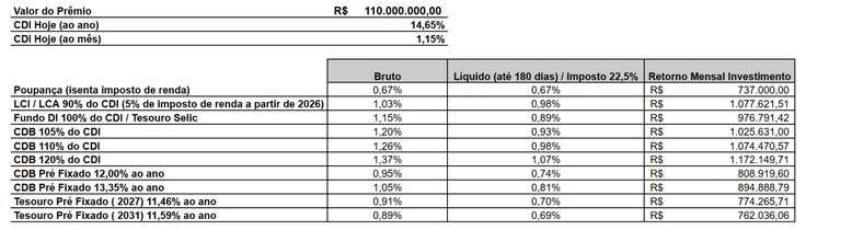 Como é possível avaliar na simulação, os R$ 110 milhões do prêmio, se investidos em LCI/LCA com 90% do CDI, renderiam ao investidor cerca de R$ 1,07 milhão mensais. Essa modalidade pagará 5% de imposto de renda a partir de 2026. Se aportados no Fundo DI 100% do CDI, o prêmio geraria um rendimento mensal de R$ 976,7 mil por mês.